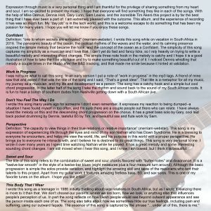 I was not sure what to call this song. In an early version I put a note of “work in progress” in the mp3 tags. A friend of mine saw that and asked if that was the title of the song and I said, “That’s a great idea!”. That title is a metaphor for all my music, my journey as a musician, and my life and development as a person. The song has a catchy hook and a simple but cool chord progression. In the latter half of the song I take the rhythm and sound back to the sound of my South African roots. It is fun to hear a bunch of southern dudes from Nashville getting down with a South African jive.